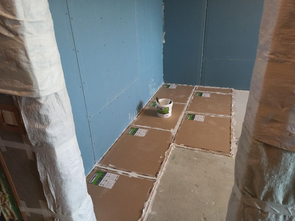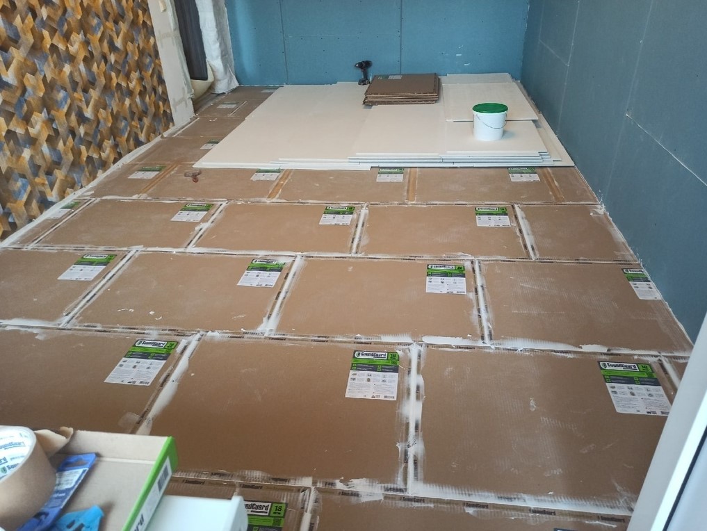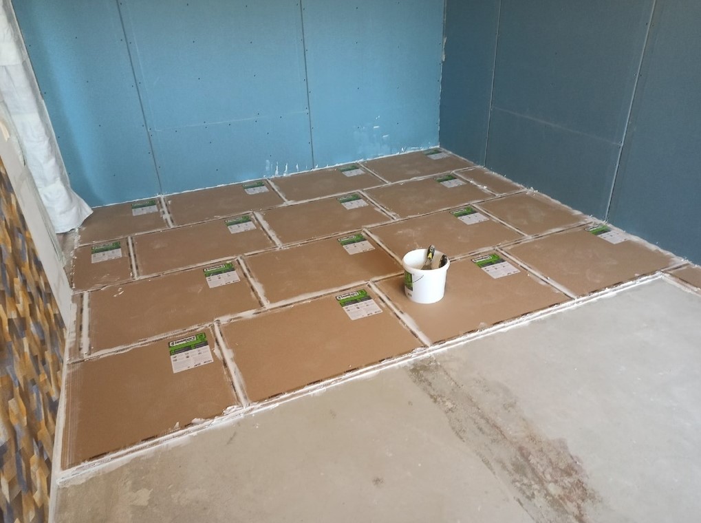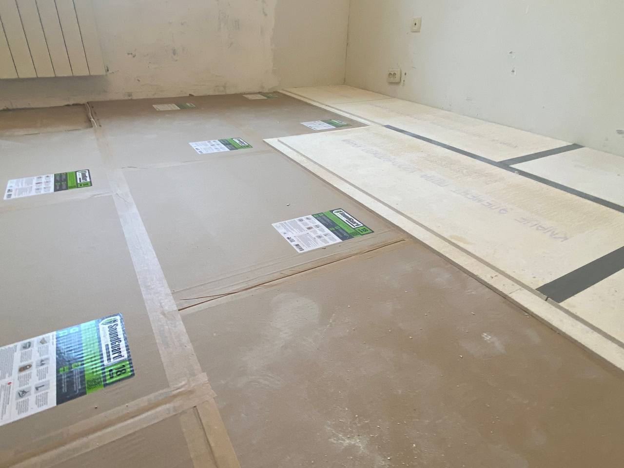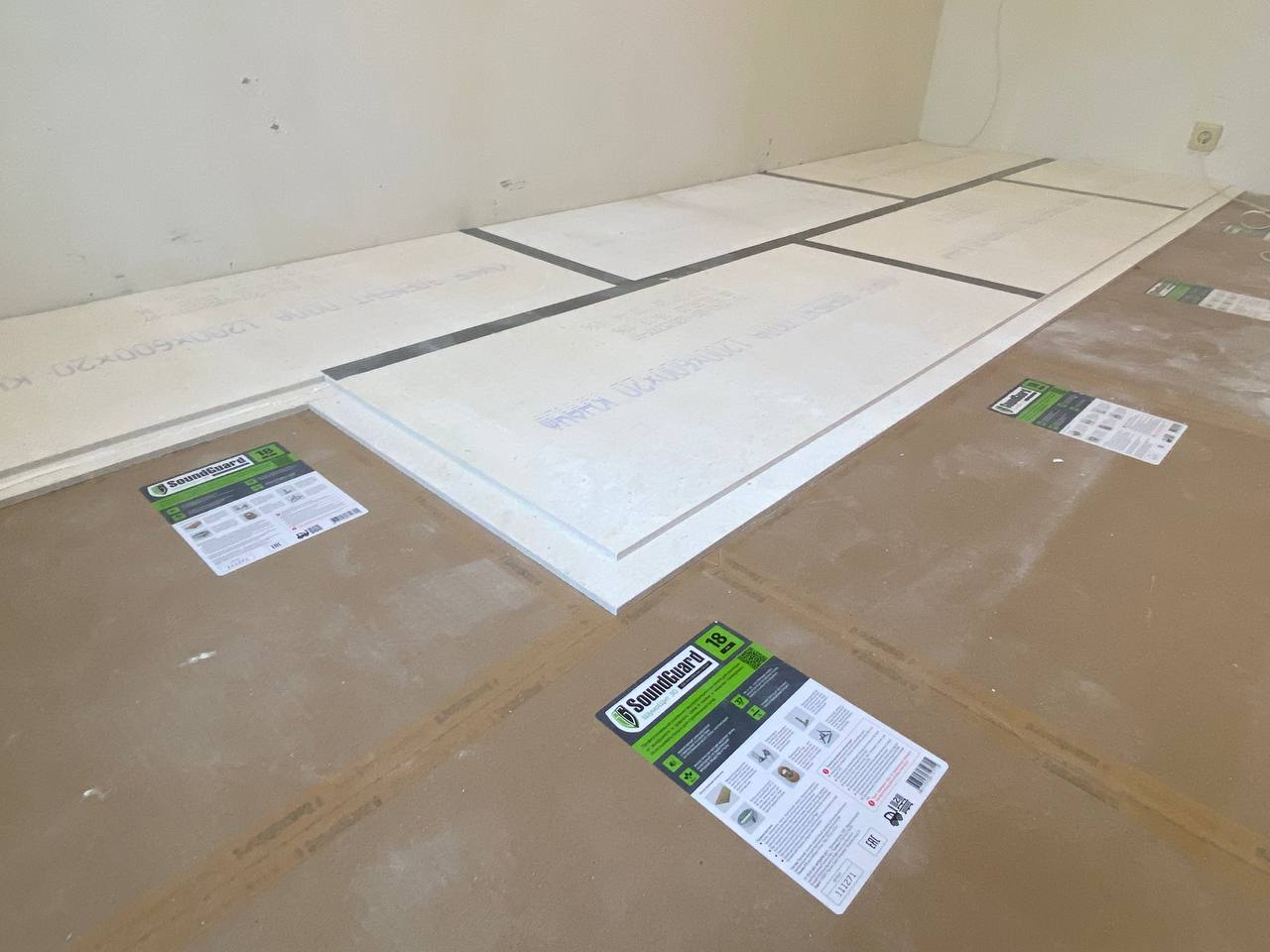 При выполнении звукоизоляции пола под финишное покрытие панели ШумоЩит укладываются мягкой стороной к полу. Панели укладываются вразбежку относительно друг друга. Все места стыков между панелями, а также места примыкания к стенам по периметру заполняются виброакустическим герметиком Soundguard. В качестве финишной облицовки используется плотный материал, такой как ГВЛВ или его аналог.